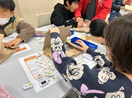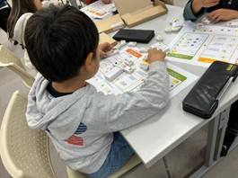 最初は使い方を思い出しながら、少し戸惑う様子も見られましたが、アドバイスしたり、違う考え方で作ったおともだちの装置を紹介したりすると、すぐに自分の装置に取り込み改善して、先生たちに笑顔で見せに来てくれました。例えば、1年生のときと同じ課題であっても、明らかに目的と結果を考えてモジュールを組み合わせているのが分かります。